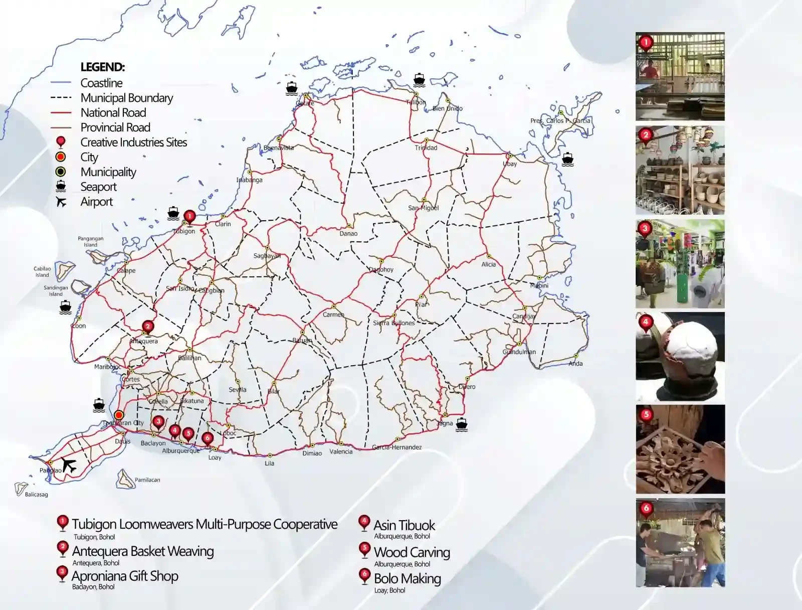 Features local artisan workshops, traditional craft centers, and creative studios where visitors can observe and purchase authentic Boholano handicrafts like basket weaving, wood carving, and traditional pottery. Photos show skilled artisans at work and beautiful handmade products. This specialized map highlights Bohol’s commitment to preserving traditional crafts while providing economic opportunities for local communities, with sites concentrated in areas known for specific craft traditions.