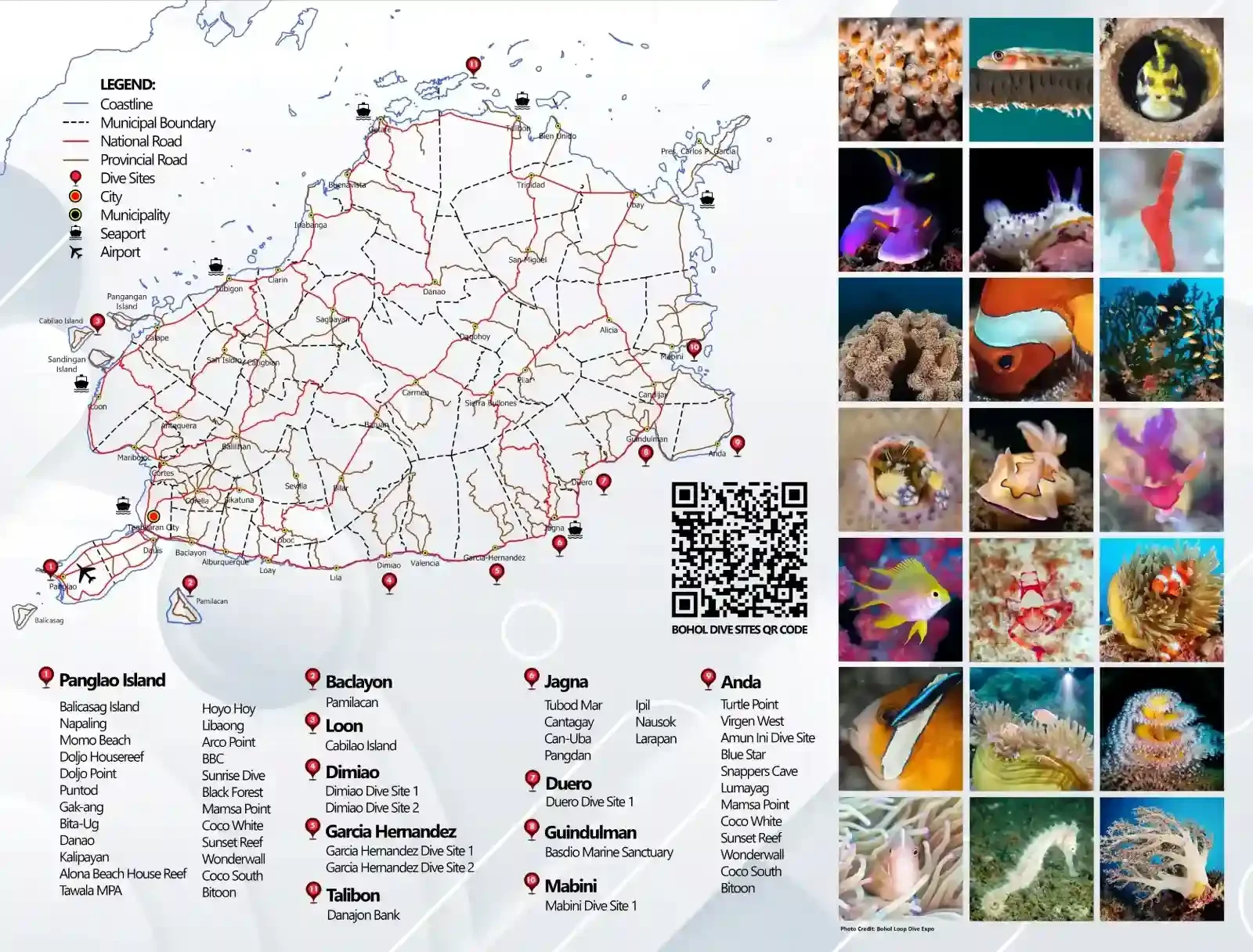 A specialized underwater exploration guide featuring 19 numbered dive sites around Bohol and Panglao waters, from the famous Balicasag Island Marine Sanctuary to world-class sites like Arco Point and BBC (Big Black Coral). The vibrant marine life photos showcase colorful coral gardens, tropical fish species, and unique underwater formations. This map includes a QR code for digital dive site information and clearly marks the best diving areas concentrated around Panglao Island and nearby marine protected areas.