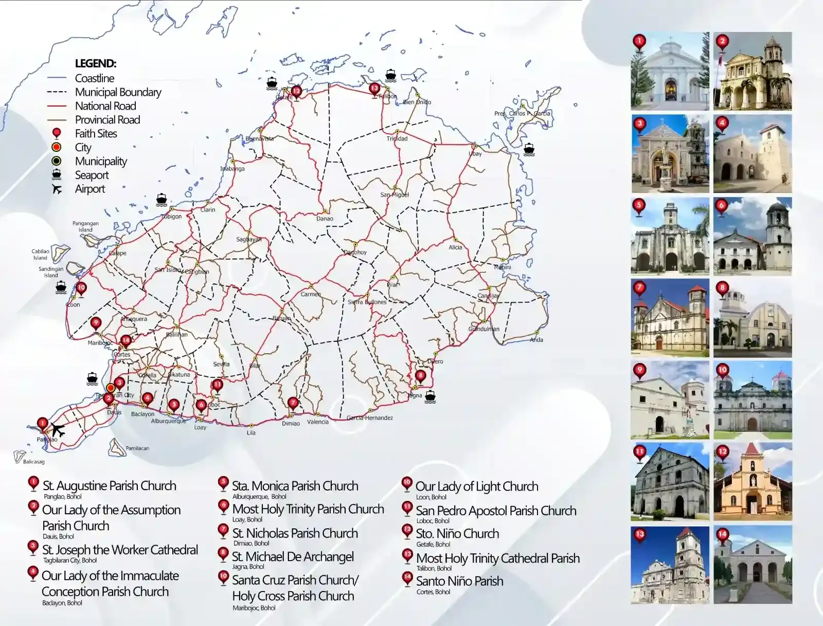 A cultural journey through Bohol’s Spanish colonial heritage, featuring 12 historic churches including the UNESCO-listed Baclayon Church (1596) and other significant religious sites like Loboc, Maribojoc, and Cortes churches. The architectural photos showcase baroque facades, stone construction, and religious artifacts that survived centuries. This map demonstrates Bohol’s importance in Philippine Catholic history and provides a route for cultural tourism focused on centuries-old ecclesiastical architecture.