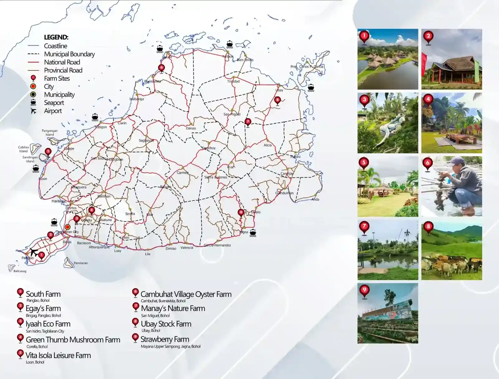 Showcases Bohol’s growing farm tourism sector with working farms, organic agriculture sites, and hands-on rural experiences like Ubay Stock Farm and various mushroom farms. Photos highlight sustainable farming practices, traditional agriculture, and farm-to-table experiences. This map reveals Bohol’s agricultural diversity beyond tourism, showing how visitors can experience authentic rural Filipino life while supporting local farming communities across different municipalities.