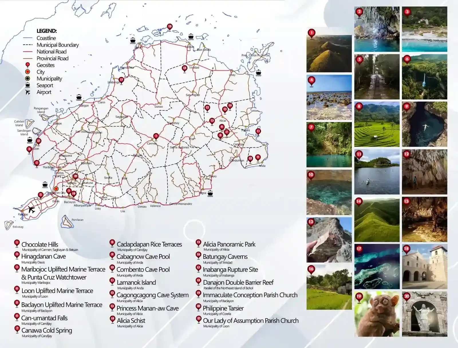 This comprehensive map showcases Bohol’s geological treasures and UNESCO Global Geopark status, featuring the iconic Chocolate Hills, ancient cave systems like Hinagdanan and Princess Manan-aw, and stunning rice terraces at Cadapdapan. The detailed photo gallery highlights limestone formations, underground rivers, and panoramic viewpoints that make Bohol a geological wonderland. Red markers indicate major geosites spread across all municipalities, showing visitors can find natural attractions throughout the entire island.