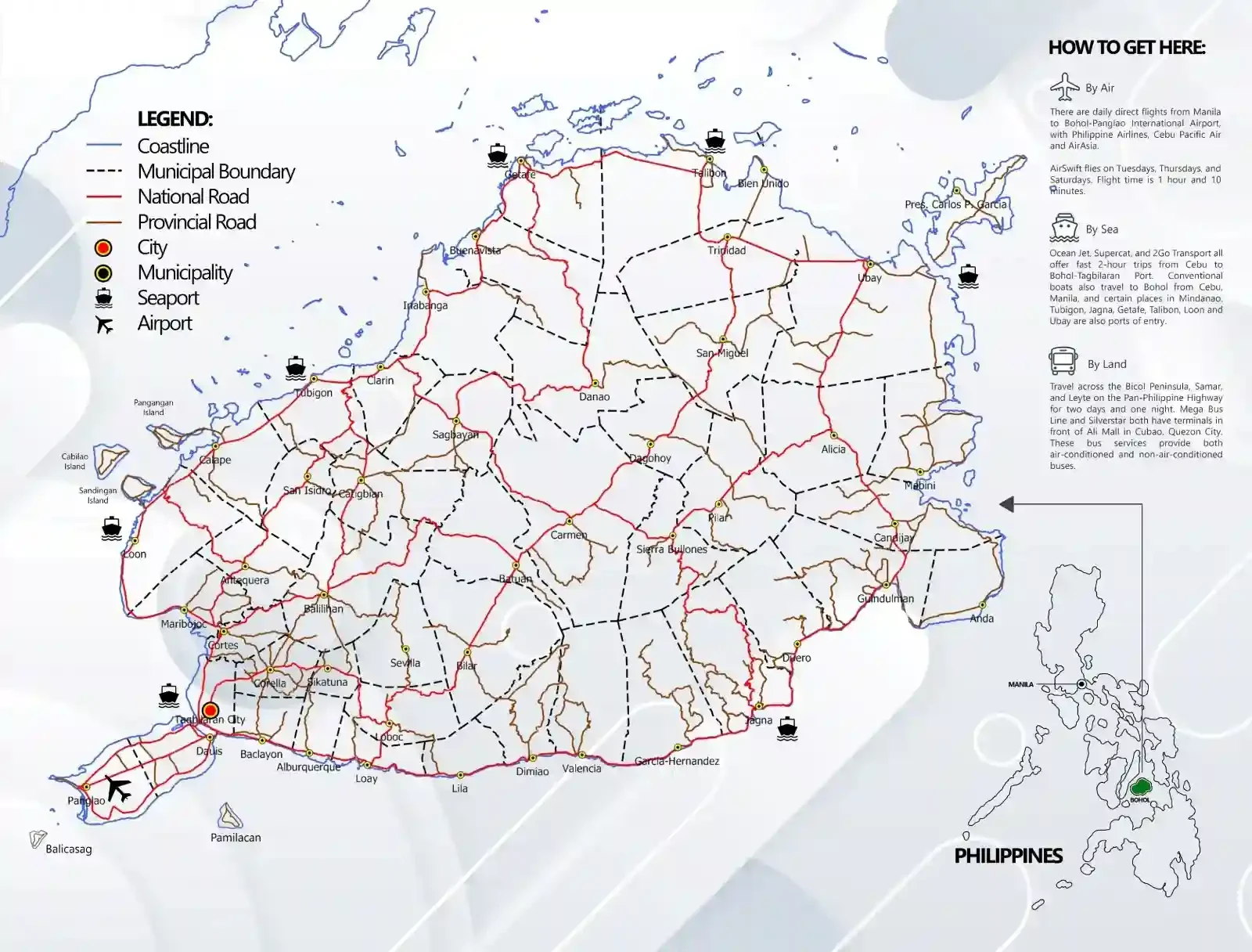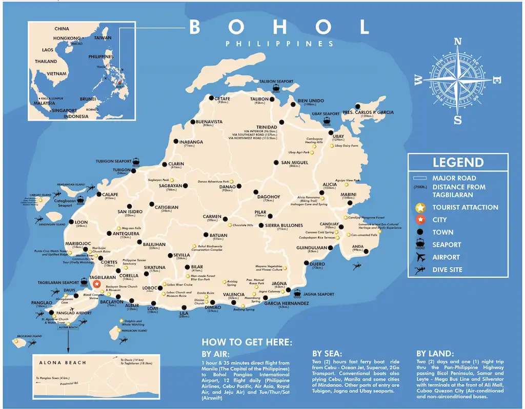 A practical reference showing major transportation routes, seaports, airports, and road networks connecting Bohol to other Philippine islands and internal destinations. Includes detailed “How to Get Here” information covering air travel (via Bohol-Panglao International Airport), sea routes from Cebu and other islands, and land transportation options. This essential planning map shows the infrastructure that makes Bohol accessible and helps visitors understand travel logistics.